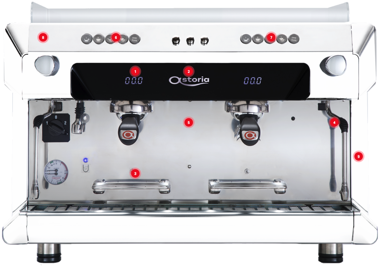 1 - Shot timer 2 - Backlit Astoria logo 3 - Fold-away cup trays 4 - Larger diameter steam nozzles 5 - LED barista lights | 6 - Sealed mechanical buttons 7 - 4 pre-set dosing buttons 8 - Front cut under the pediment 9 - Solid metal body panel (excluding curbs) |