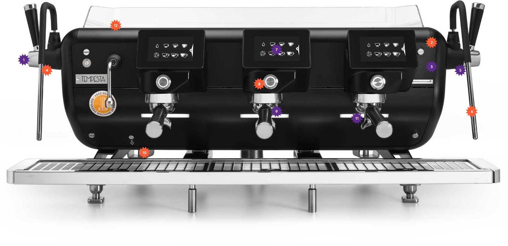 | 1 - Multiboiler system 2 - Active group temperature control 3 - Pressure stabilisation system 4 - Dry steam system 5 - Ergonomic steam activation 6 - Cool touch wands | 7 - Custom display 8 - Fast activation button 9 - Calibrated baskets/shower screens 10 - Adjustable tray height 11 - Dimmable tray lights 12 - Energy saving |